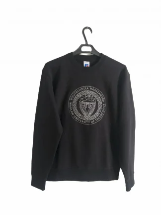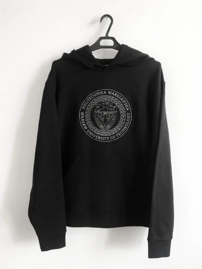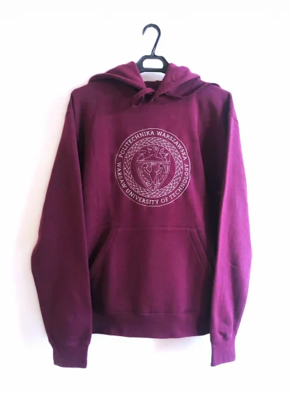 Bluza z kapturem typu kangurek w kolorze granatowym i bordowym z haftowanym logo PW.  Posiada jedną dużą kieszeń. Wykonana  została z 80% bawełny i 20% poliestru.