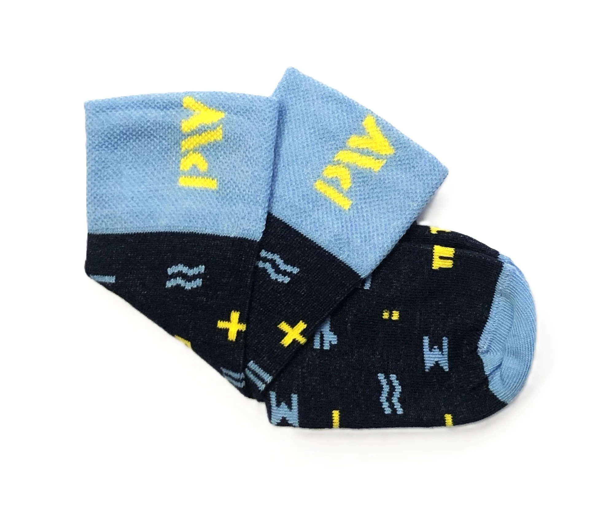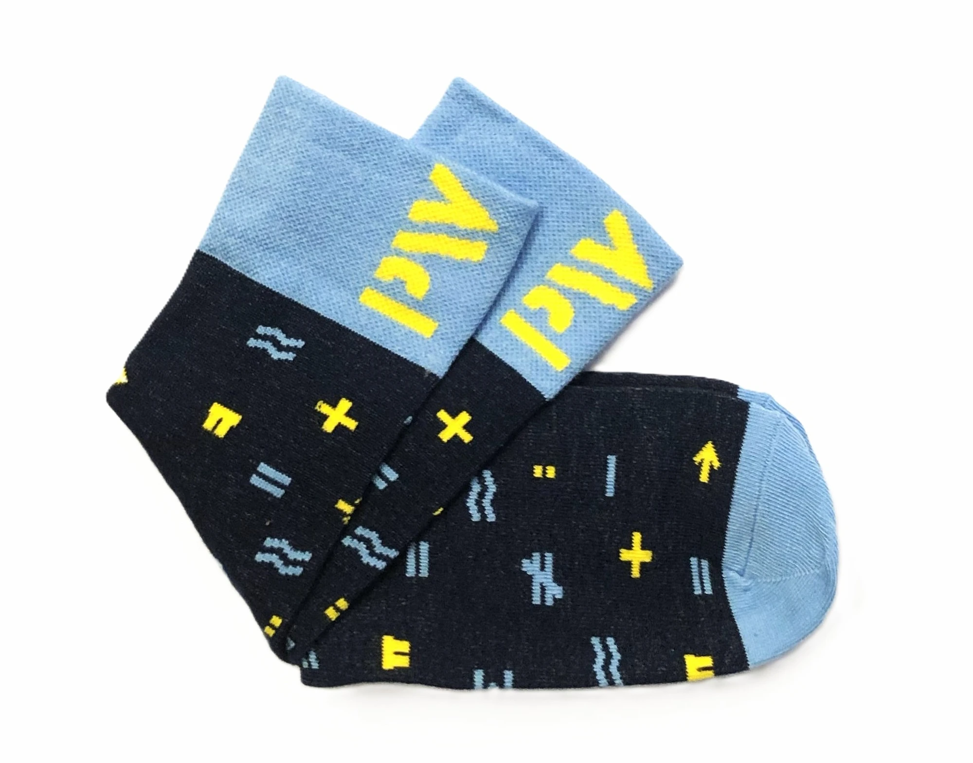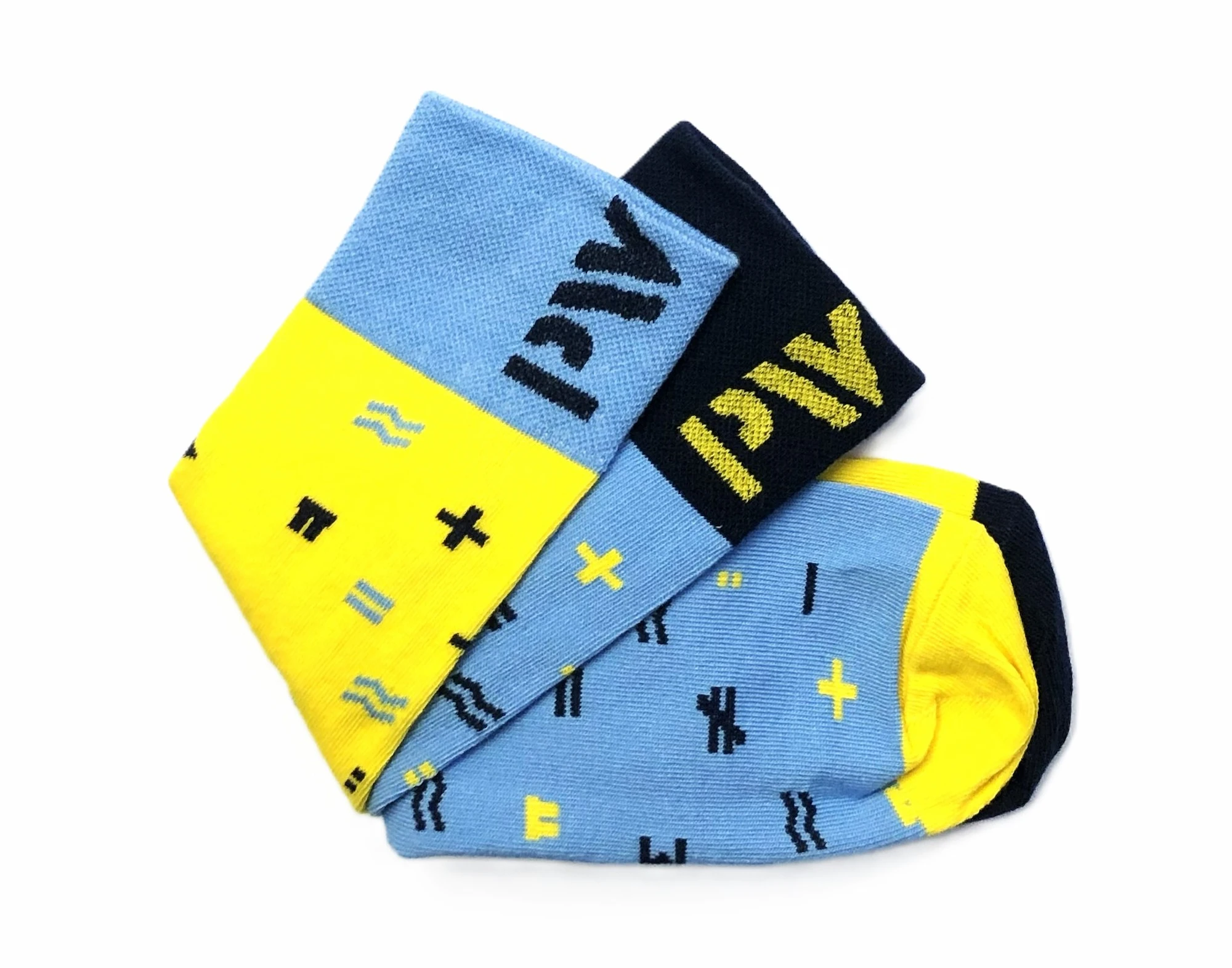 Komfortowe politechniczne skarpetki ze znakami matematycznymi – na każdą okazję. Klasyczne warianty kolorystyczne i kolory „nie-do-pary”: granatowo-niebieskie, żółte i pomarańczowe, niebieskie i żółte…